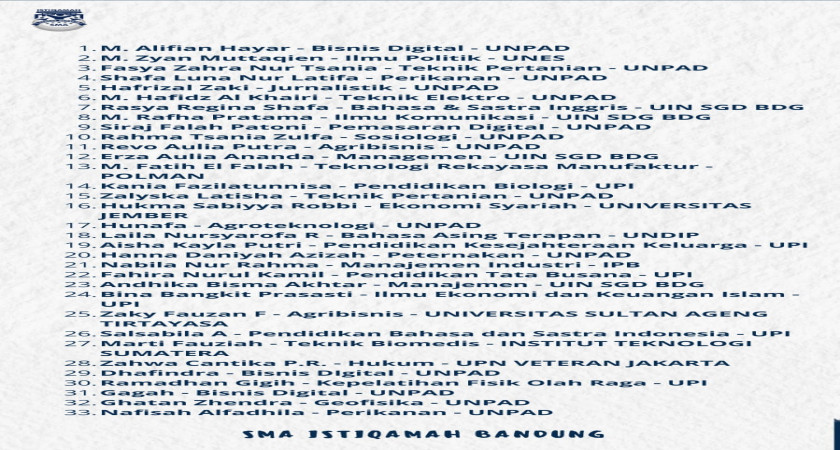 Tahun ini siswa siswi SMA Istiqamah Bandung makin bertambah banyak yang lolos dan masuk ke PTN terbaik melalui jalur SNBP dan SNBT/UTBK. Tahun ini ada 4 orang siswa yang lolos jalur SNBP, dan 29 orang siswa jalur SNBT/UTBK dari jumlah siswa seluruhnya 100 orang kelas XII.